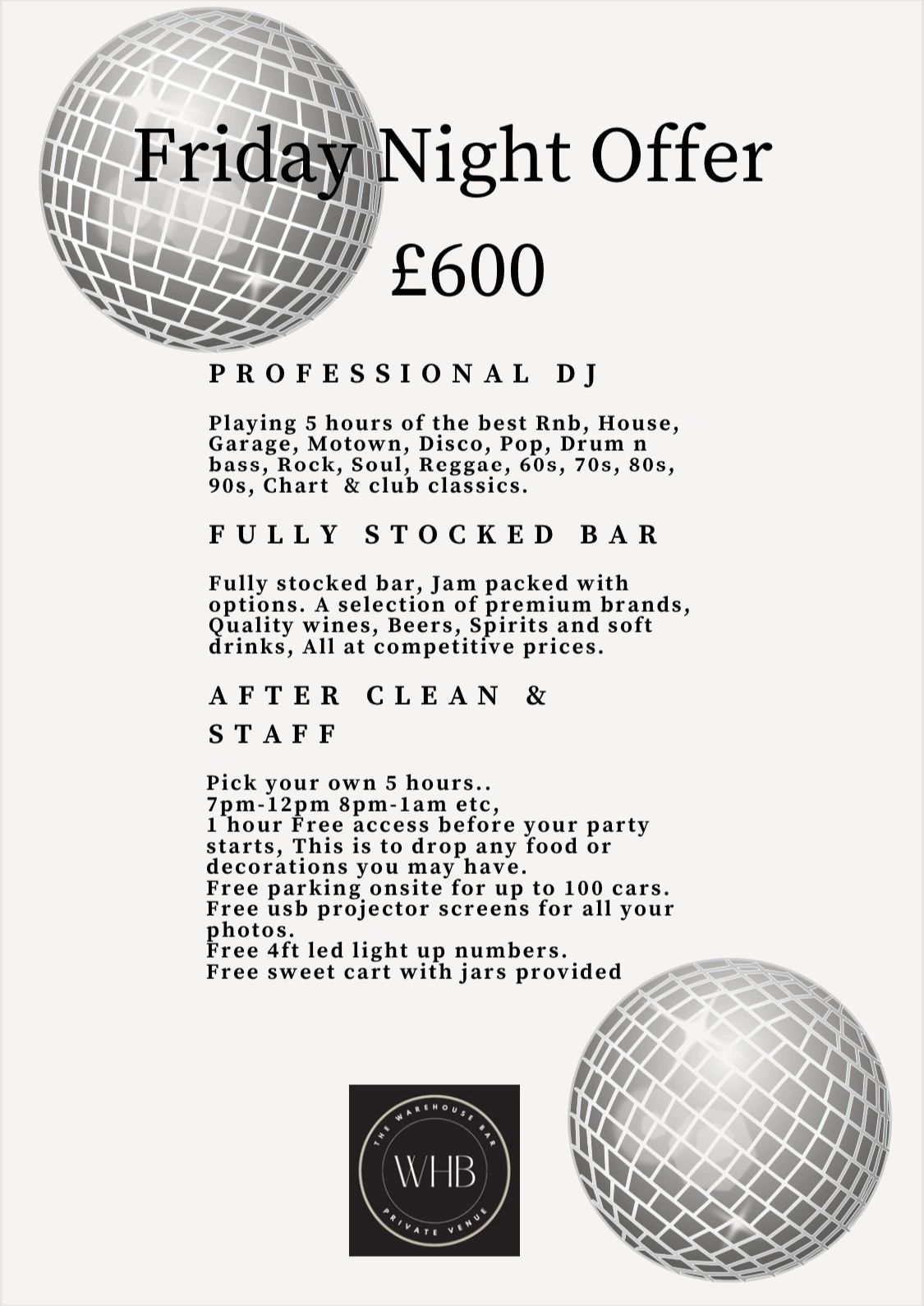 DJs on request. £50 for every hour after the standard 5 hour booking . customers are allowed to supply their own djs but they must be covered by their own liability insurance and hold certificates.